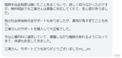 傷病手当金制度は聞いたことあるくらいで、詳しく知らなかったのですが、無料相談でも三浦さんは真摯に対応してくれて、安心感がありました。