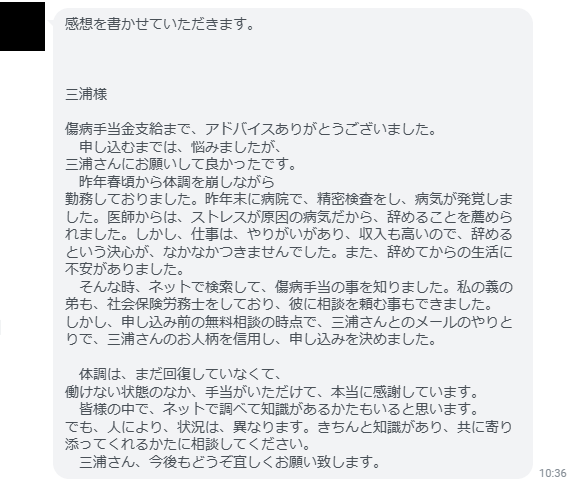 働けない状態のなか、手当がいただけて、本当に感謝しています。