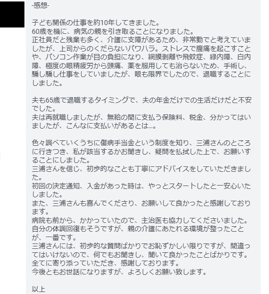 色々調べていくうちに傷病手当金という制度を知り、三浦さんのところに行きつき、私が該当するかお聞きし、疑問を払拭した上で、お願いすることにしました。