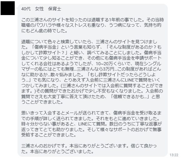 退職について色々と検索していたら、三浦さんのサイトを見つけました。「傷病手当金」という言葉も知らず、「そんな制度があるのか?もしかして詐欺サイト?」と疑い、調べてみることにしました。傷病手当金について少し知ることができ、その他にも傷病手当金を申請サポートしてくれる会社はあるようでしたが、10~20万くらいで、現在シングルマザーの私にはとても無理…三浦さんなら3万円…この制度があればどんなに助かるか…散々悩みました。「もし詐欺サイトだったらどうしよう…」でも気になり、とりあえず入会前に三浦さんにLINEで質問をいくつかしてみました。(三浦さんのサイトでは入会前に質問することができます。)その質問ができたおかげで少し不安もなくなりました。入会前の質問でさえも大変丁寧に答えて頂けたため、「信頼できるかも…」と思うことができました。
