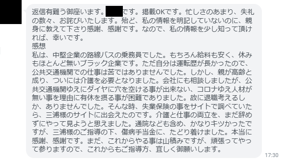 そんな時、失業保険の事をサイトで調べていたら、三浦様のサイトに出会えたのです。介護と仕事の両立を、まだ辞めずにやって見ようと思えました。