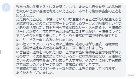 いざ会社に退職を申し出た日は、この後本当に傷病手当金の承認が降りるのかや、その他先のことでいろいろと不安な気持ちになり、三浦様についその気持ちを吐露してしまったのですが、そのことに対しても前向きで励ましのメッセージを頂き、非常に心強かったです。