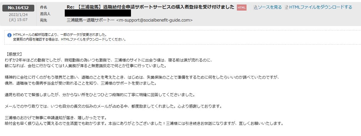 本日は、最大28ヶ月の退職給付金申請サポートサービスのご利用者様のご感想になります。