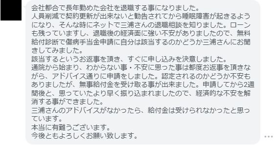 人員削減で契約更新が出来ないと勧告されてから睡眠障害が起きるようになり、そんな時にネットで三浦さんの退職相談を知りました。ローンも残っていますし、退職後の経済面に強い不安がありましたので、無料給付診断で傷病手当金申請に自分は該当するのかどうか三浦さんにお聞きしてみました。