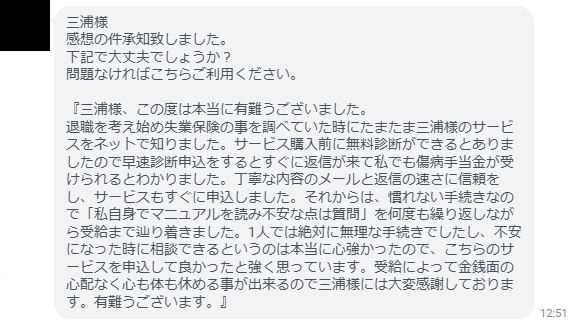 退職を考え始め失業保険の事を調べていた時にたまたま三浦様のサービスをネットで知りました。