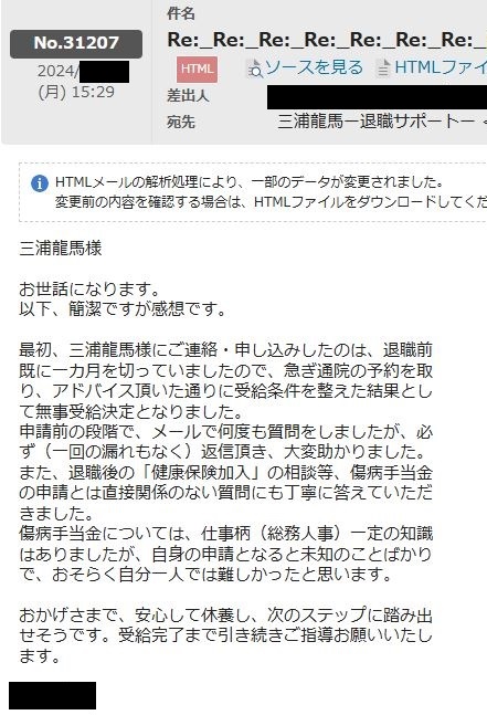 おかげさまで、安心して休養し、次のステップに踏み出せそうです。受給完了まで引き続きご指導お願いいたします。