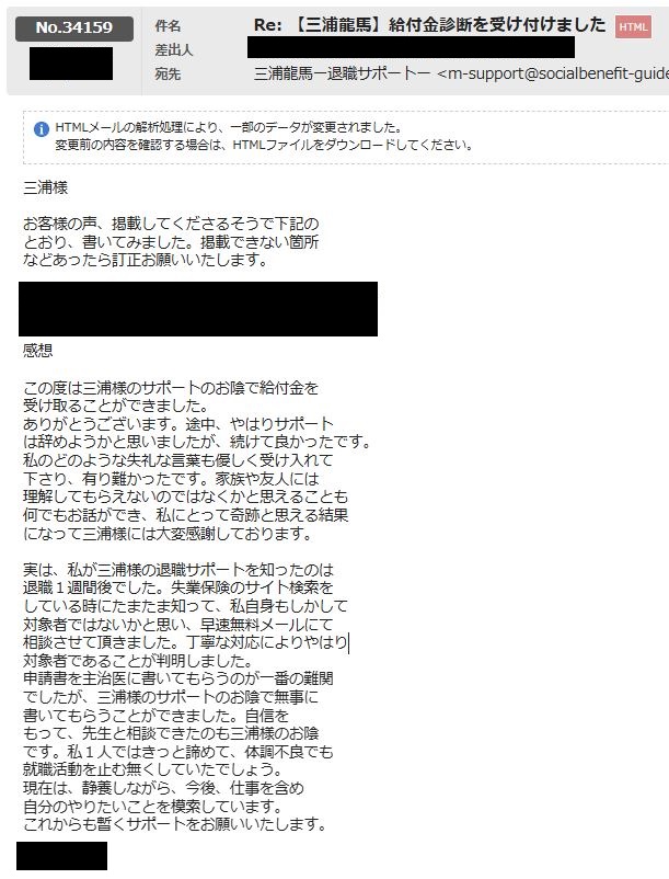 この度は三浦様のサポートのお陰で給付金を受け取ることができました。