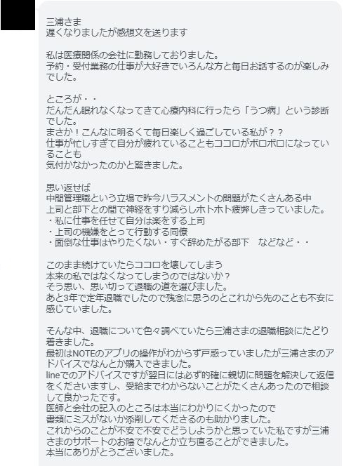 当初は、私自身のつらい退職体験から立ち上がりましたが、このお声のように多くの方のご協力をへて、今やいろいろな方の経験や気持ちがこもったサービスになりました。