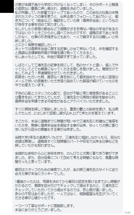 1番良かったのは、申請を決めてから最初の認定を受けるまで少し時間がかかるので、書類を自分だけでチェックして提出するのと、三浦先生にチェックしていただいてから提出するのでは、安心感が違いました。